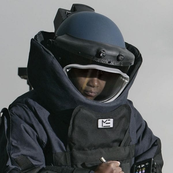 It is designed to integrate with the Med-Eng EOD 9 Bomb Suit for complete protection EOD/IEDD blast protection.